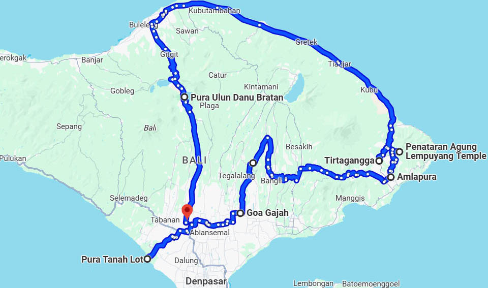 🔁 Rijrichting: Zuid-Bali → Oost-Bali → Noord → Terug naar het Zuiden